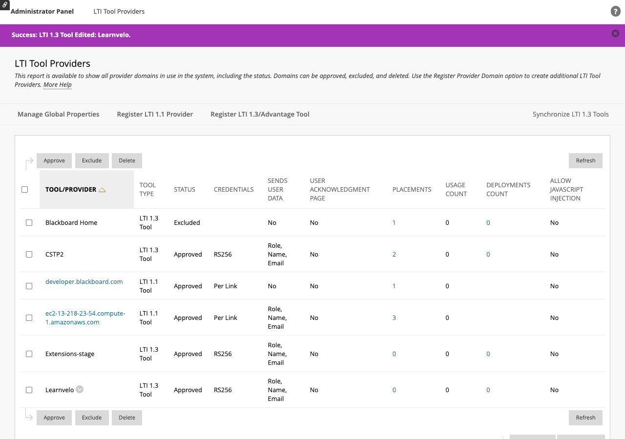 - In the LTI Tool Providers list, click the placements count link next to Learnvelo