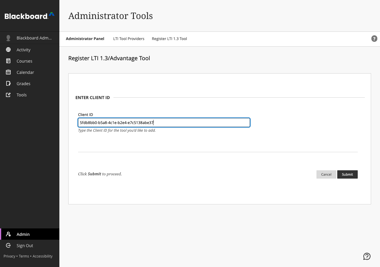 Blackboard uses a centralized tool registration model. Learnvelo is already registered in the Blackboard developer portal, so setup is straightforward — you enter Learnvelo's Application ID in your Blackboard admin panel, configure the tool, and then enter the resulting Deployment ID in Learnvelo.