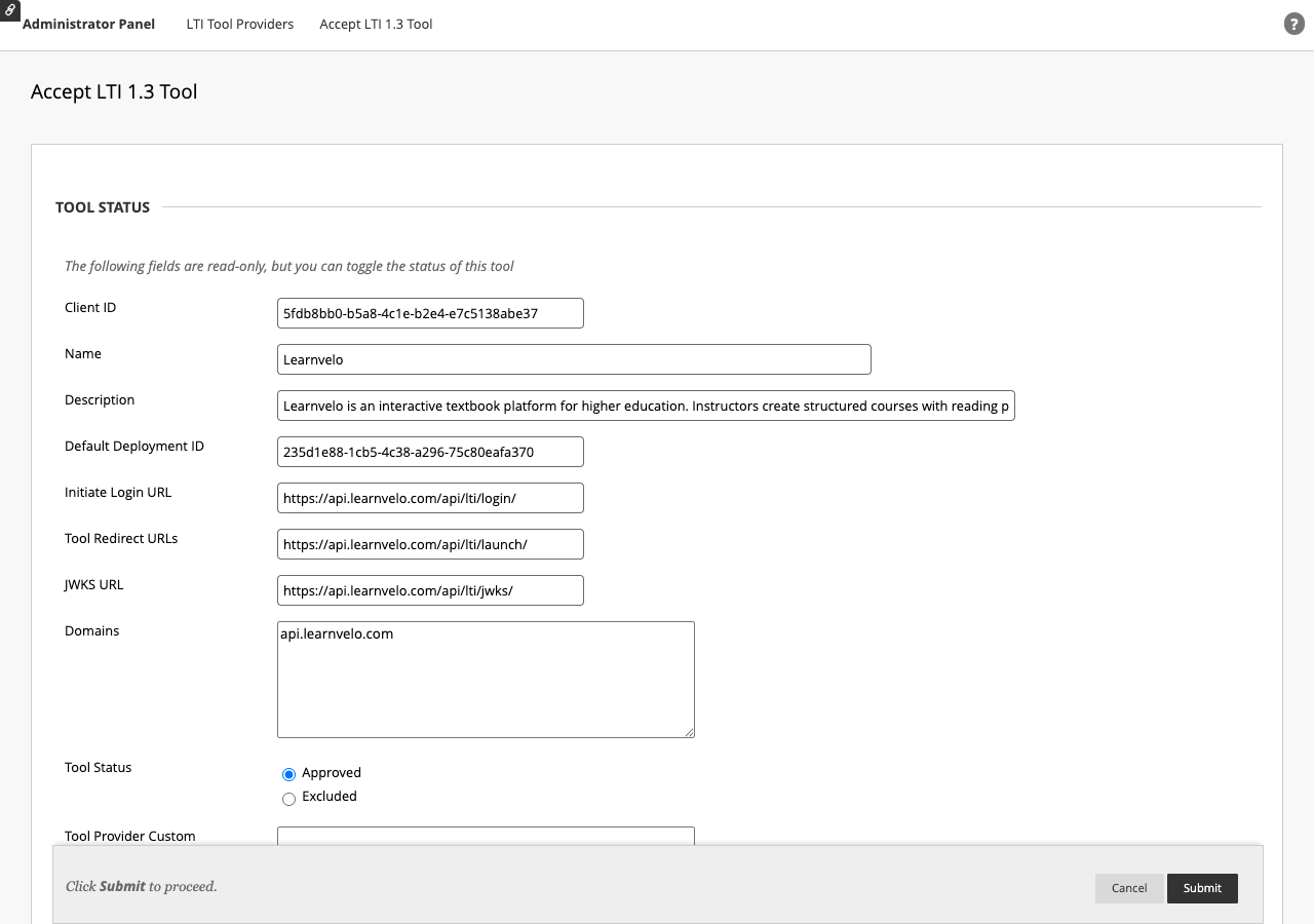 - Learnvelo will appear in the LTI Tool Providers list with status Approved