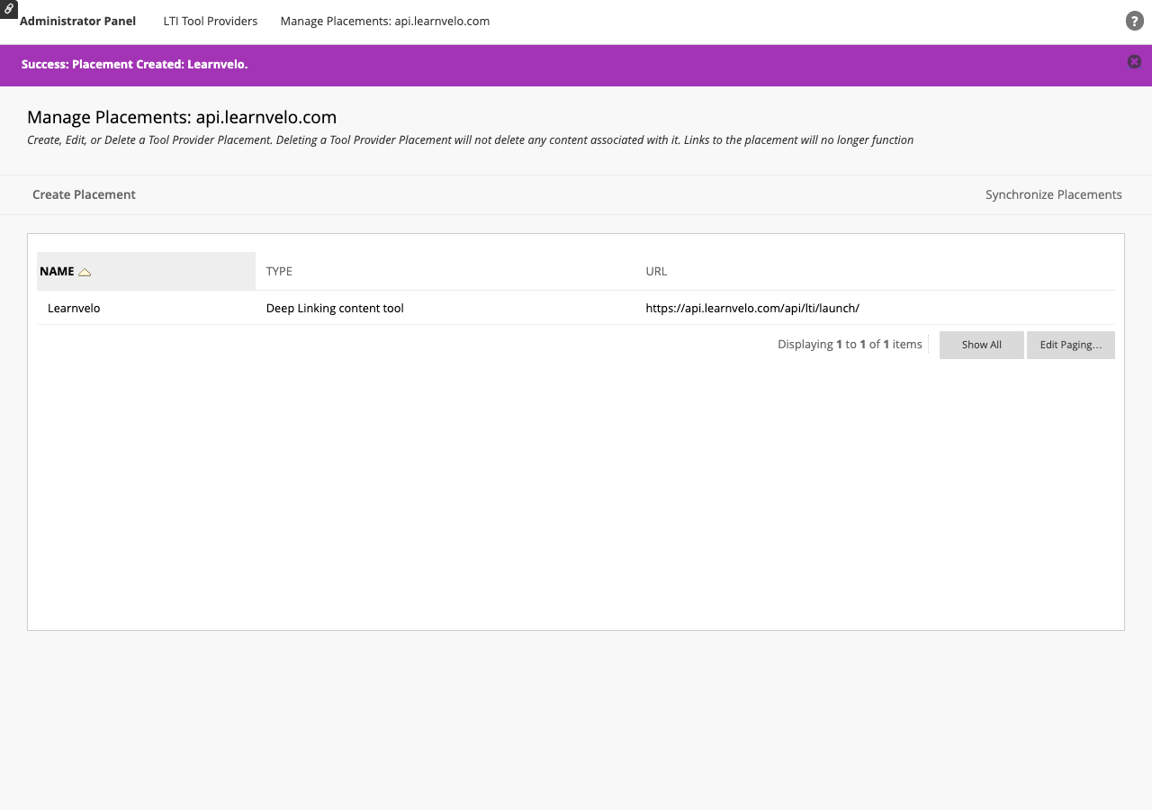 After the tool is registered, you need to create placements to control where Learnvelo appears for instructors: