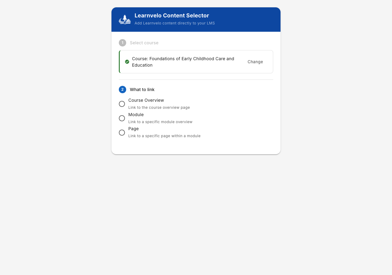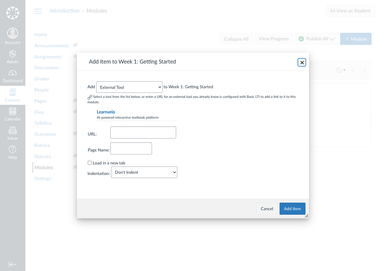 This guide shows instructors how to add Learnvelo content (courses, modules, and pages) into their LMS using the deep linking integration. Once your LMS administrator has completed the Learnvelo LTI setup, you can follow these steps to link Learnvelo content directly into your course.