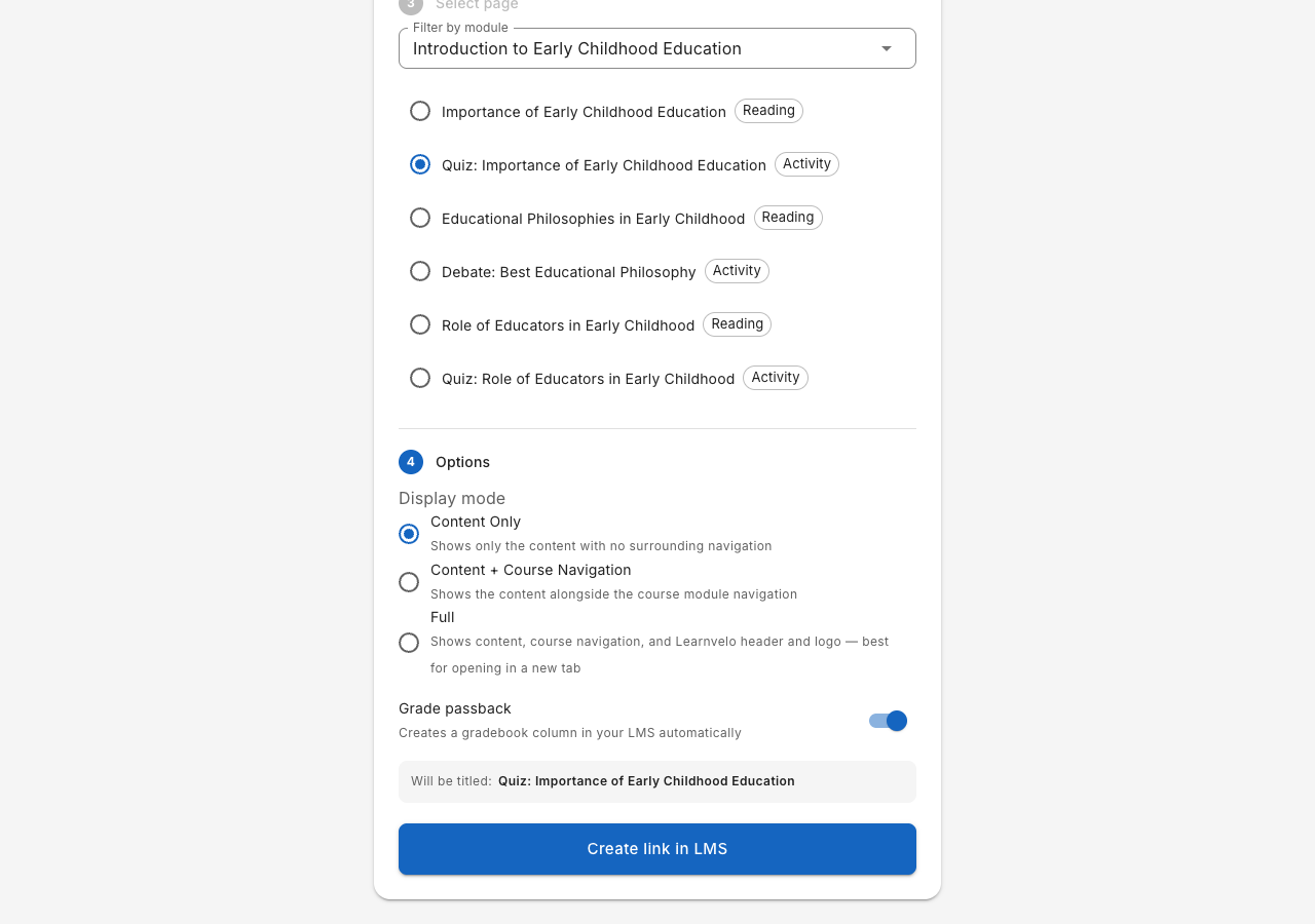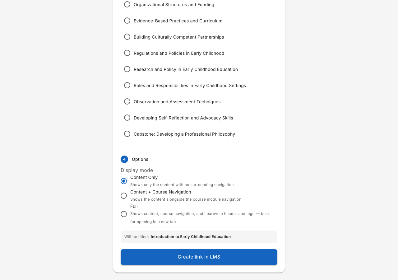 This step appears when you chose Module or Page (Course Overview skips directly to options).