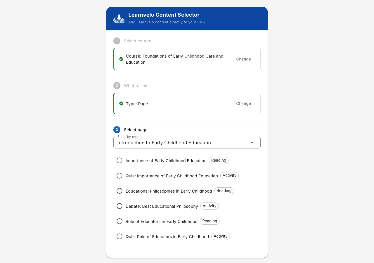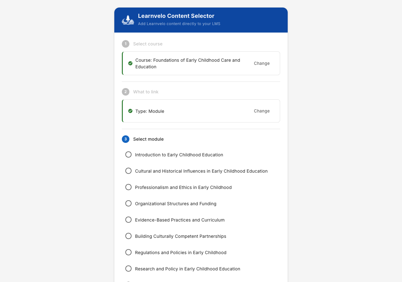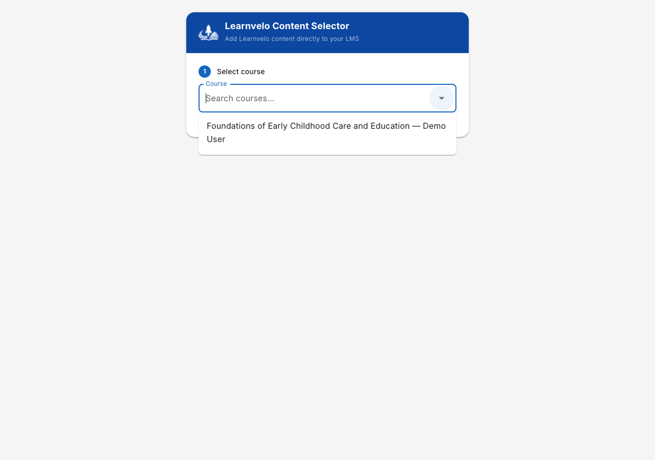 Learnvelo uses LTI Deep Linking to let you select and embed content from within your LMS. When you add Learnvelo as an external tool in your LMS course, a content picker opens that lets you: